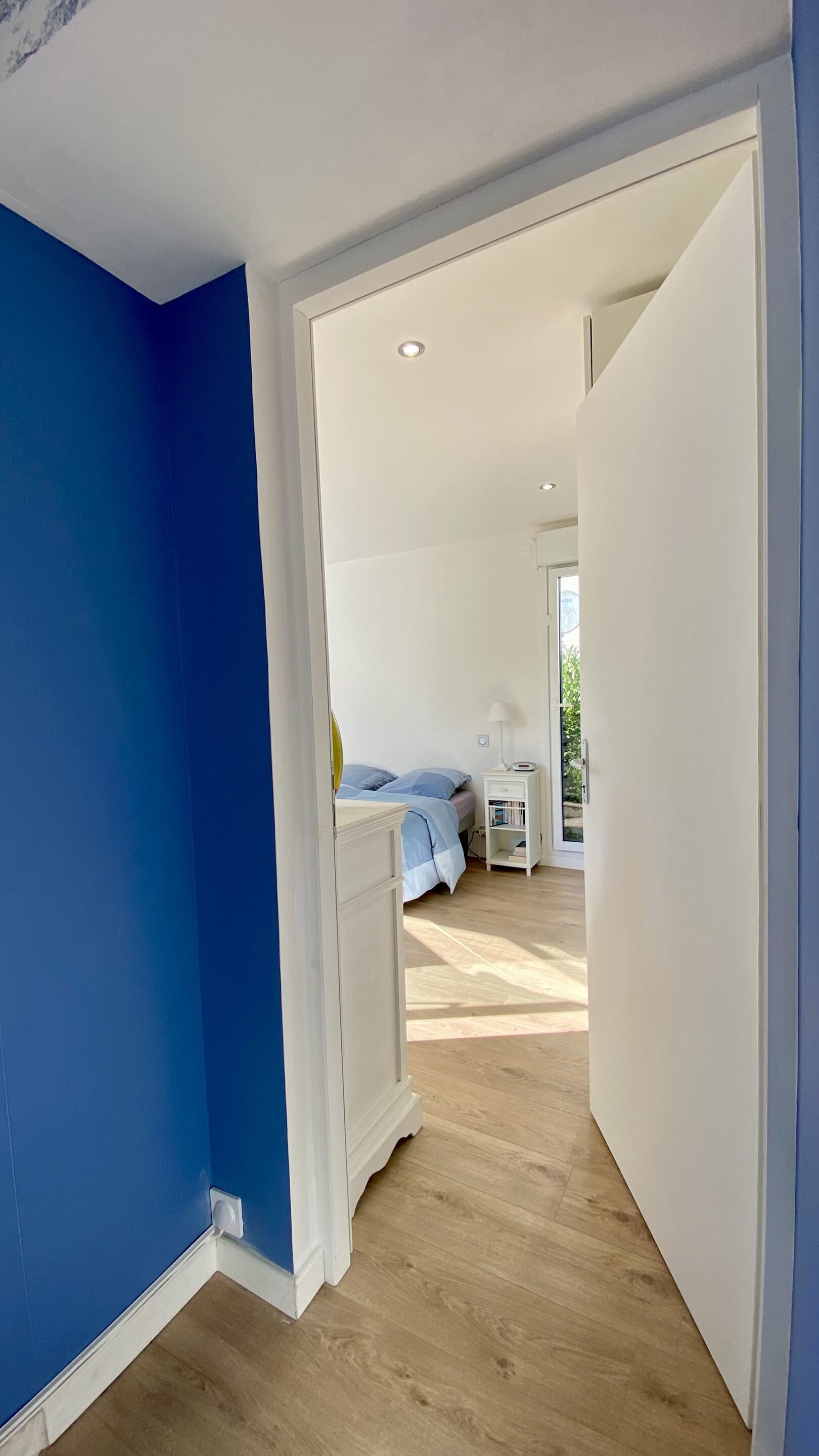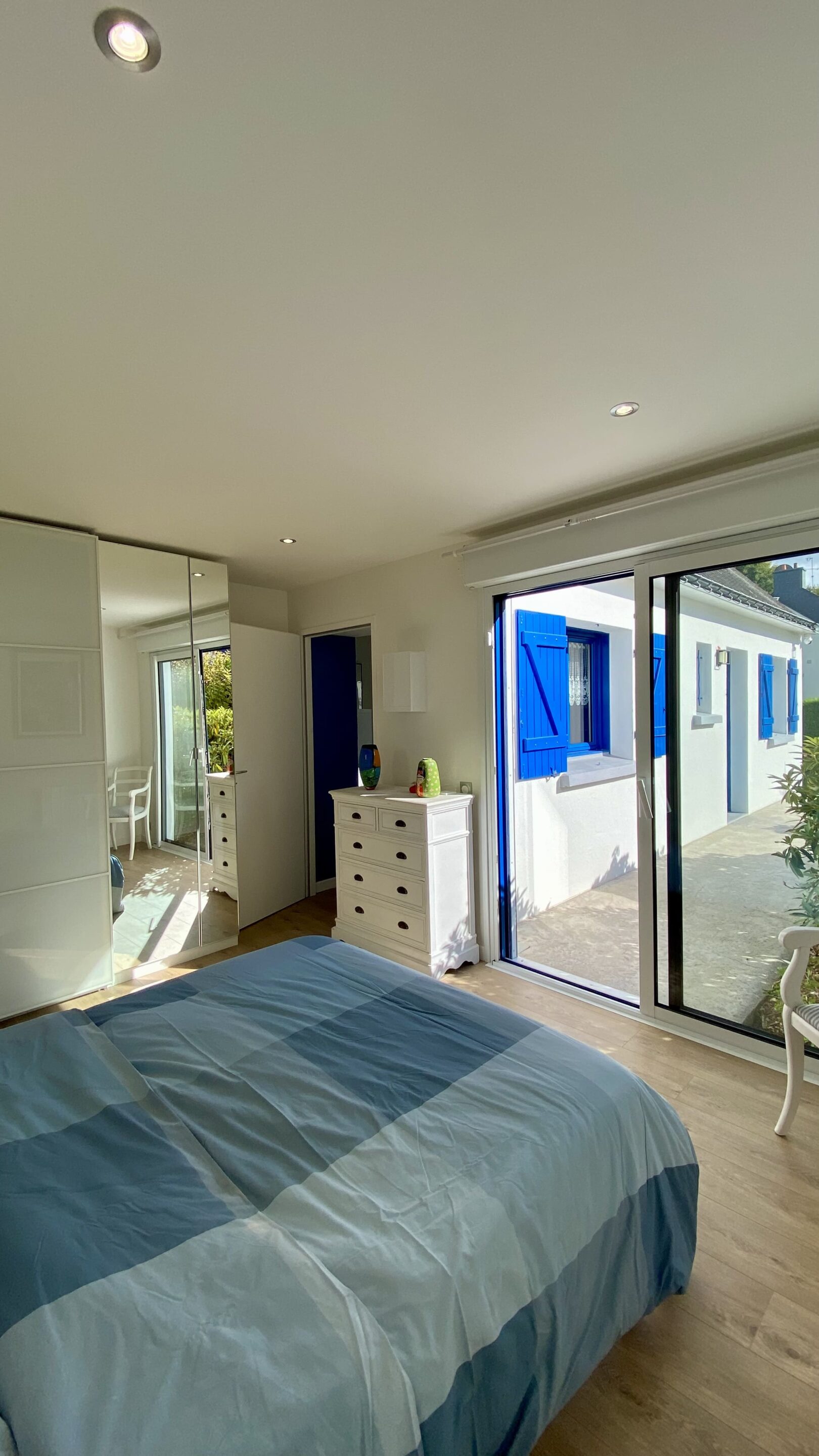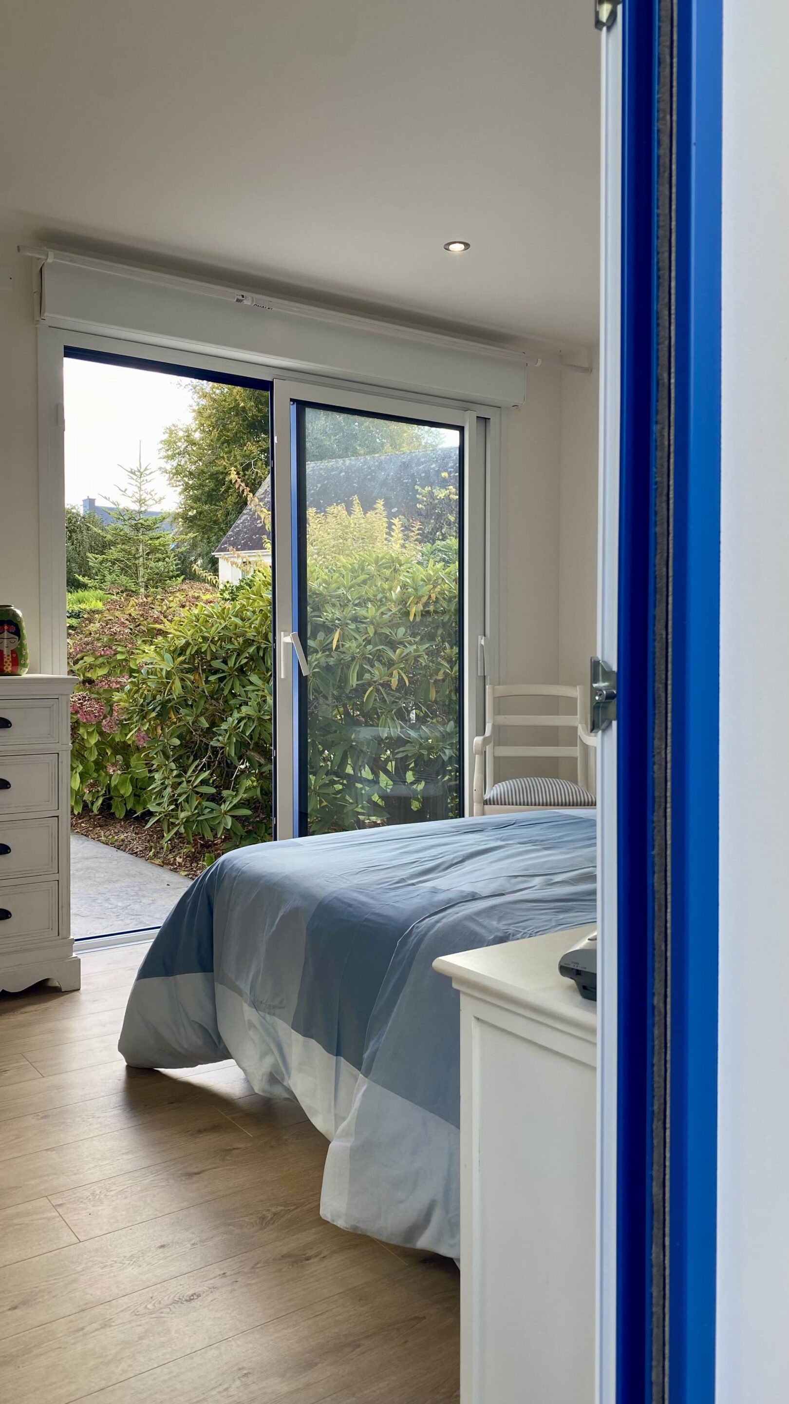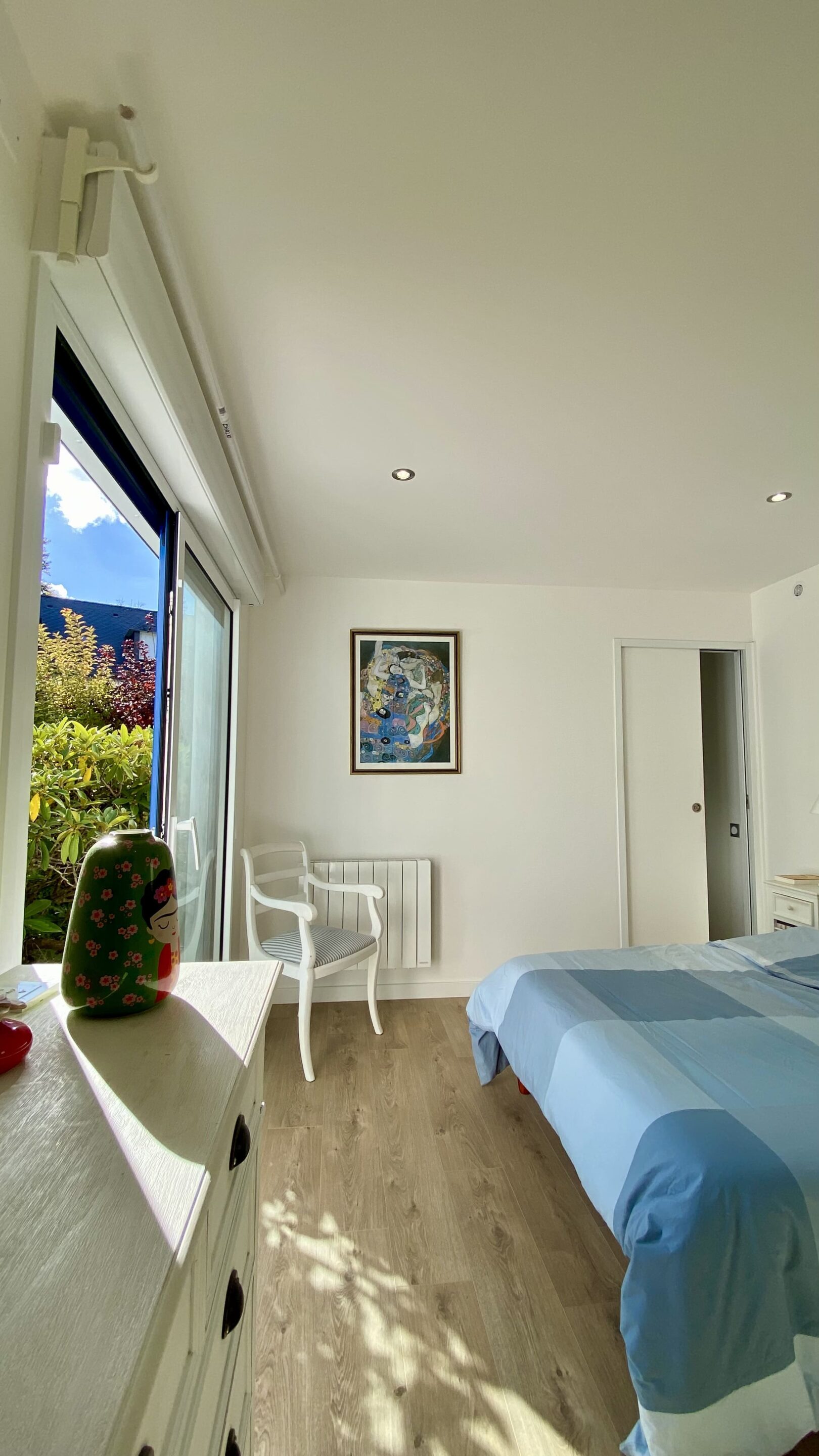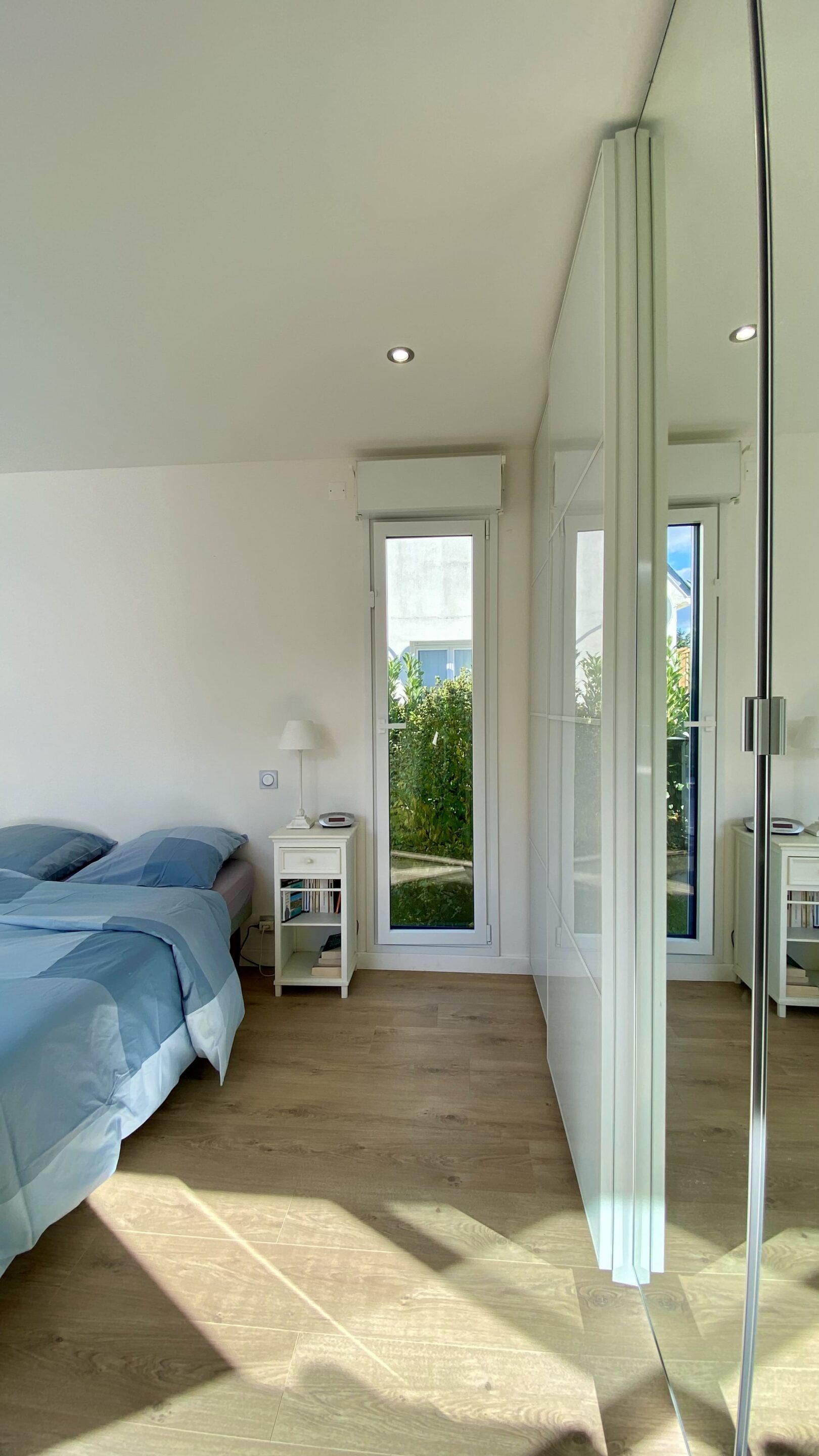 « Je voulais une vraie chambre avec salle de bain, tout en restant de plain-pied. Aujourd’hui, j’ai gagné 20 m² habitables, bien exposés plein sud. Je lis sur le lit avec le soleil… j’adore cette chambre ! »