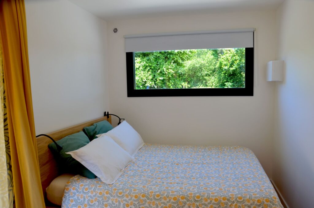 Orientée vers l’Est, la fenêtre de la chambre est munie d’un store pour se prémunir de la trop grande clarté.